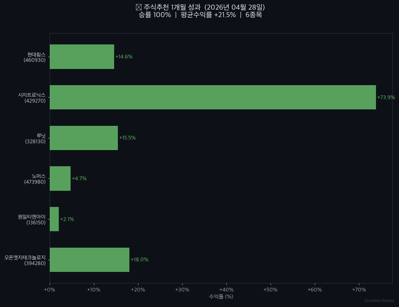 안녕하세요, 주식 투자자 여러분! 오늘은 2026년 3월 말에 추천드린 주식들의 1개월 성과를 회고해보는 시간을 갖겠습니다. 이번 추천에서는 총 6종목을 선정했으며, 놀랍게도 모든 종목이 수익을 기록하며 승률 100%를 달성했습니다. 평균 수익률도 21.5%로 상당히 만족스러운 결과를 보여주었습니다.